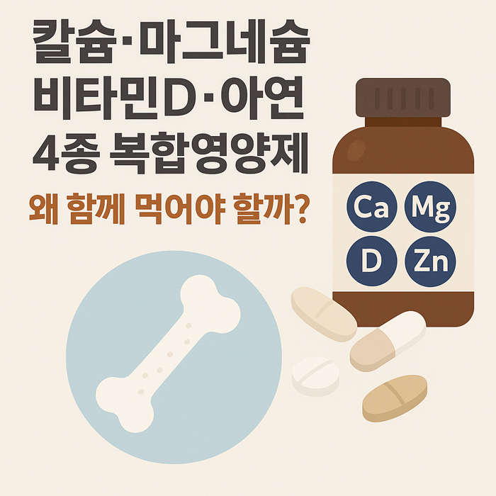 칼슘·마그네슘·비타민D·아연 4종 복합영양제는 서로의 효과를 높이며 뼈 건강, 면역력, 신경 기능까지 종합적으로 관리할 수 있는 이상적인 조합입니다. 중장년층, 폐경기 여성, 수면 문제나 근육 경련이 있는 분들에게 추천되는 '하루 한 알 건강 습관'이 될 수 있습니다.