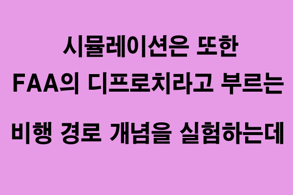 시뮬레이션은 또한 FAA의 디프로치라고 부르는 새로운 비행경로 개념을 실험하는데 이는 이 출발점에서 이동할 때 여러 방향으로 비행할 수 있고 공기 제한에 대응해야 할 경우 지정된 비행경로를 넘어 적응할 수 있습니다.