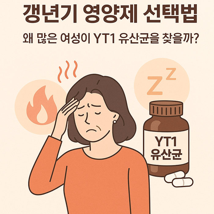 그 과정에서 YT1 유산균은 갱년기 기능성을 인정받은 특화 균주라는 점에서 많은 여성들의 선택을 받고 있습니다. 특히 안면홍조, 수면 문제, 피로감 등으로 일상이 힘들어졌다면, 갱년기 영양제 조합 가운데 하나로 YT1을 고려해 보는 것도 충분히 의미 있는 선택입니다.
