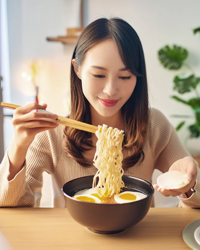 4. 그릇에 라면을 담고 반숙 계란과 원하는 토핑을 올려주세요.