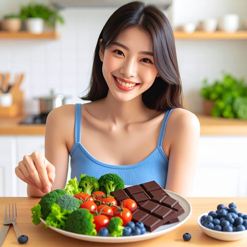 A. 아침: 블루베리+견과류+그릭요거트 점심: 토마토 수프 또는 브로콜리 찜 간식: 다크초콜릿+녹차 저녁: 생포도 또는 레드와인 한 잔(무알콜 가능)