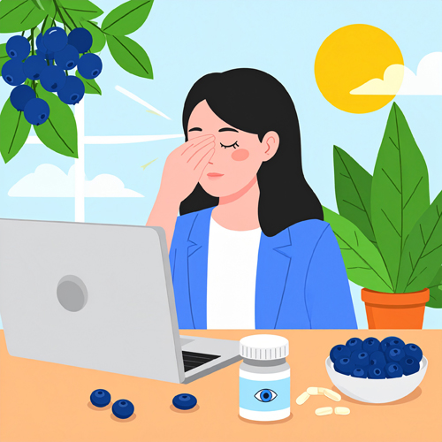 블루베리의 핵심 성분인 안토시아닌은 망막의 로돕신 재합성을 도와 야맹증 예방과 시력 보호에 기여합니다.