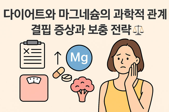 칼로리 제한만으로는 체중 감량의 한계에 부딪히기 쉽습니다. 다이어트 성공의 핵심은 영양 균형이며, 그중 마그네슘은 에너지 생성·근육 기능·신경 안정·혈당 조절 등 300+ 효소 반응에 관여하는 필수 미네랄입니다.