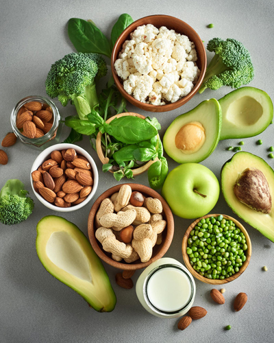 식물성 단백질 : 콩, 렌즈콩, 병아리콩, 두부, 템페, 에다마메, 퀴노아, 견과류, 씨앗, 통곡물.
