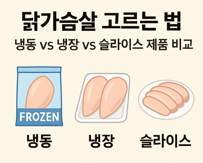 냉동 닭가슴살은 생닭을 급속 냉동한 형태로, 유통기한이 길고 대량 구매가 가능해 가성비가 좋습니다. 하지만 해동이 필요하고 조리 시 퍽퍽한 식감이 날 수 있습니다.
