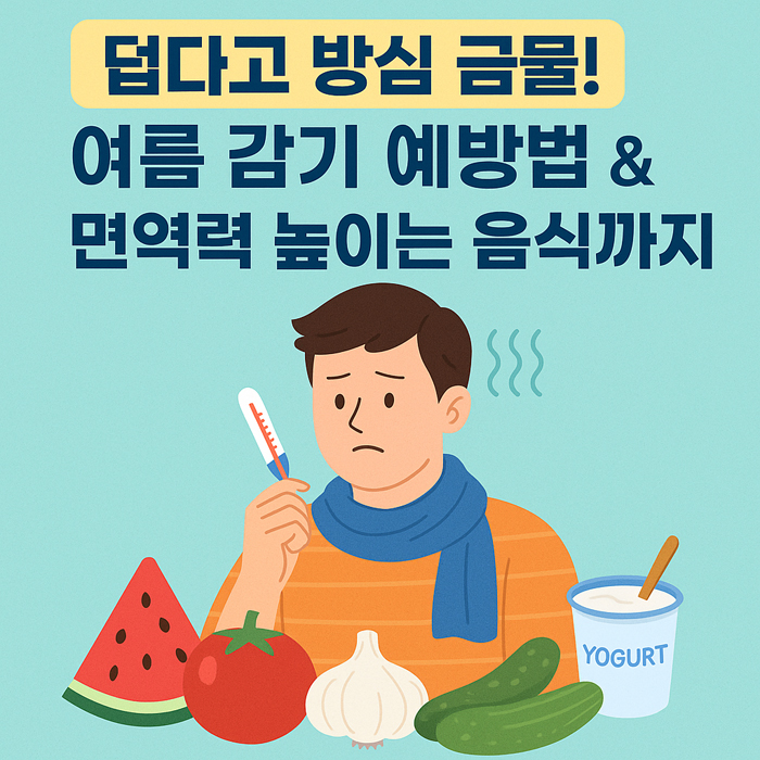여름 감기는 실내외 온도 차, 냉방, 탈수, 영양 불균형 등으로 인해 누구에게나 찾아올 수 있습니다. 방심하지 말고, 에어컨 조절·수분 보충·제철 음식 섭취·면역력 관리로 여름철 건강을 지켜주세요.