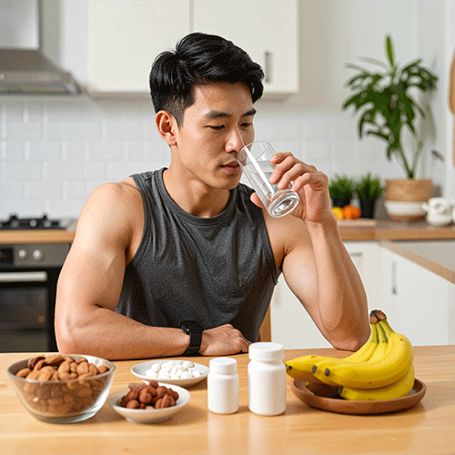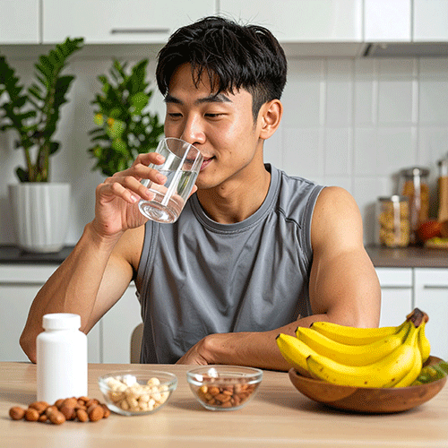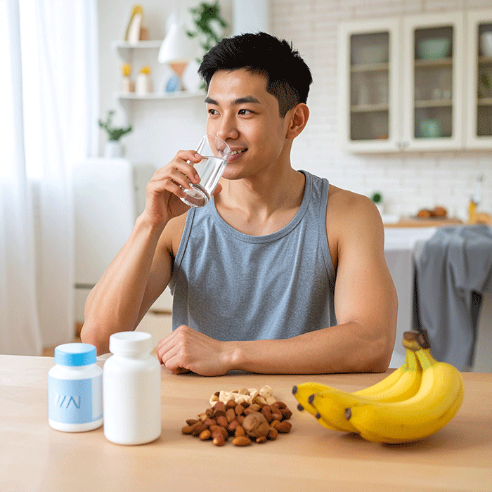 - 수분 부족: 전해질 균형 저하 → 하루 물 6~8잔 목표