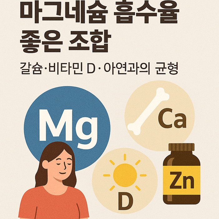 핵심 요약: 마그네슘은 칼슘·비타민 D·아연과 균형 있게 섭취할 때 흡수율과 체감 효과가 극대화됩니다. Ca:Mg는 2:1을 기준으로, 비타민 D는 식후 섭취·햇볕 노출을 병행하고, 아연은 권장량을 지키세요.