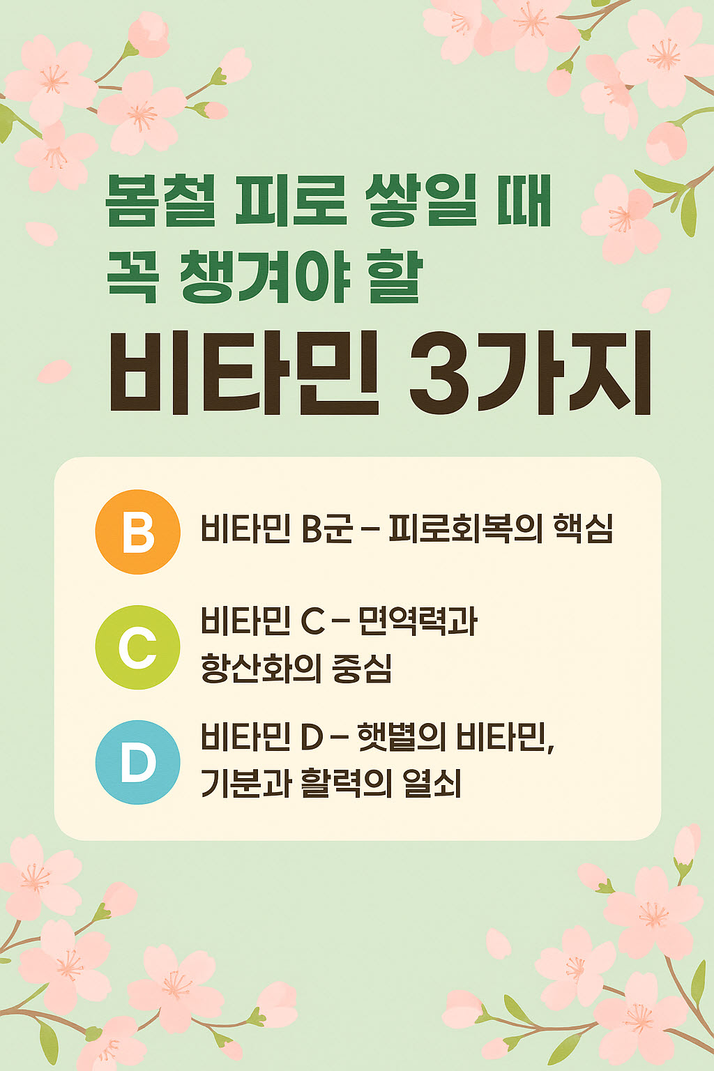 봄철 피로는 누구에게나 찾아올 수 있지만, 그만큼 관리가 쉬운 피로이기도 합니다. 비타민 B군, C, D를 중심으로 일상 속 활력을 되찾아보세요. 피로 회복과 기분 전환, 면역력 강화까지 이 세 가지 비타민이 도와줄 거예요.