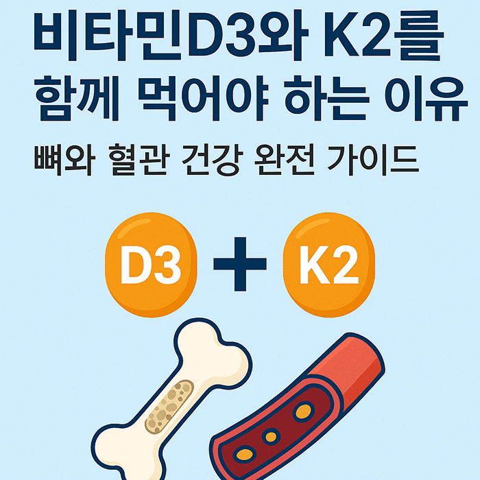 핵심 요약 — 비타민D3는 칼슘을 흡수시키고, 비타민K2는 그 칼슘을 뼈로 보내며 혈관 침착을 억제합니다. 둘 중 하나만으로는 완성되지 않으며, 함께 섭취할 때 뼈는 튼튼하게, 혈관은 깨끗하게 관리할 수 있습니다.