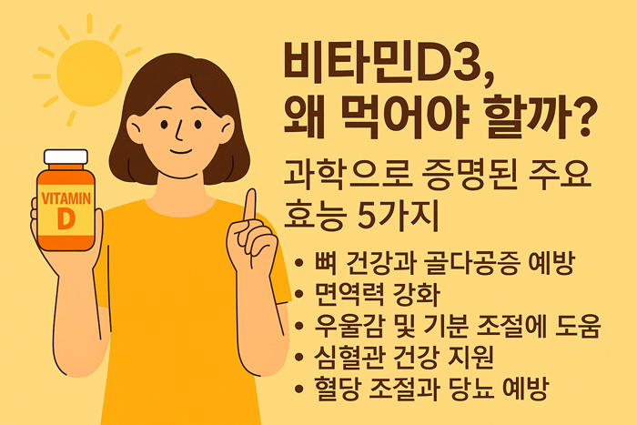 비타민D3는 흔히 ‘햇빛 비타민’이라고 불리며, 체내에서 다양한 역할을 수행하는 필수 지용성 비타민입니다. 예전에는 단순히 뼈를 튼튼하게 해주는 영양소 정도로 여겨졌지만, 최근 들어 수많은 연구에서 면역 기능 강화, 우울감 개선, 심혈관 건강 및 혈당 조절까지 광범위한 효능이 밝혀지며, 건강관리의 핵심 성분으로 떠오르고 있습니다.