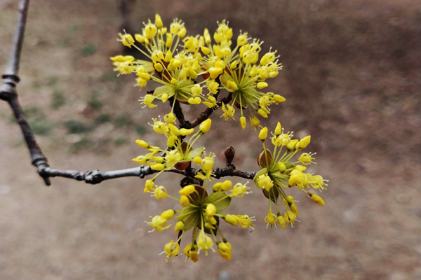 산수유 나무는 다른 나무들이 꽃을 피우기 전인 이른 봄에 밝은 노란색 꽃을 피우는데
