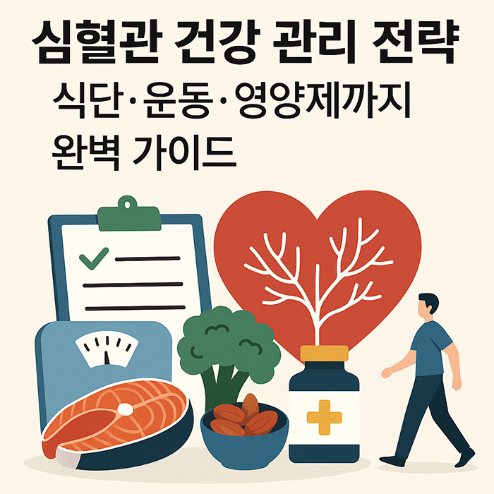 핵심 요약: 식단(저염·저당·고섬유) + 운동(유산소+근력) + 영양제(필요 시) + 생활습관(금연·절주·수면·스트레스)의 균형이 심혈관 건강을 지킵니다.