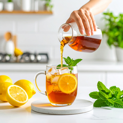 - 얼음이 든 컵에 우려낸 차를 부어 식힙니다.