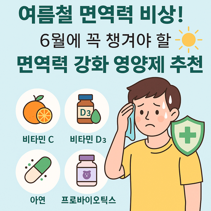 여름철 면역력 저하는 방치하면 다양한 질환으로 이어질 수 있습니다. 꾸준한 영양제 섭취와 함께 수면, 수분 보충, 균형 잡힌 식단을 병행하세요. 면역력은 단기전이 아닌 장기전입니다. 지금이 바로 건강을 준비할 때입니다.