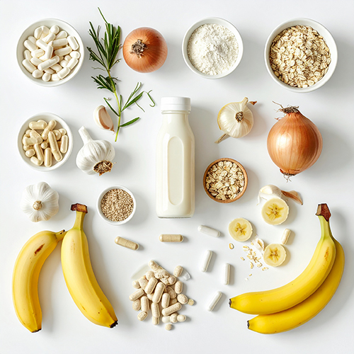 프리바이오틱스는 유익균의 먹이가 되는 성분입니다. 대표적으로 식이섬유, 올리고당, 이눌린 등이 있으며, 장 속 유익균이 잘 자랄 수 있도록 환경을 만들어 줍니다.