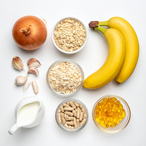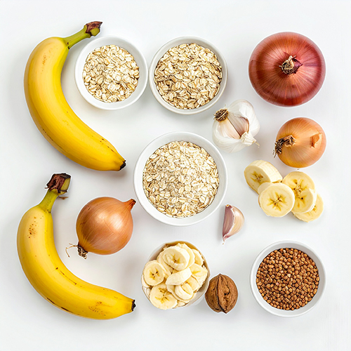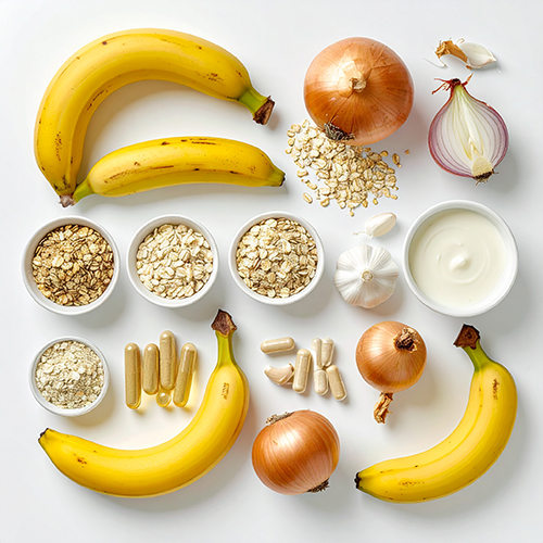 식이섬유, 바나나, 양파, 마늘, 귀리 같은 식품은 유익균이 자라기 좋은 환경을 만드는 데 도움을 줍니다. - 식습관 관리 병행하기