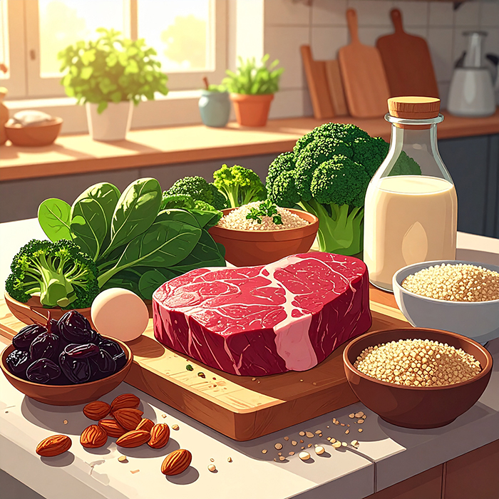 - 매 끼니에 철분 식품 1가지 이상 포함(예: 점심—시금치나물, 저녁—두부/살코기)