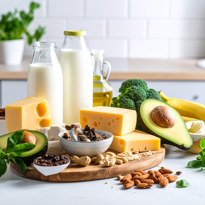 칼슘이 풍부한 식품: 우유·요거트·치즈 같은 유제품, 멸치·뱅어포 등 소형어, 두부·청국장, 케일·브로콜리·청경채