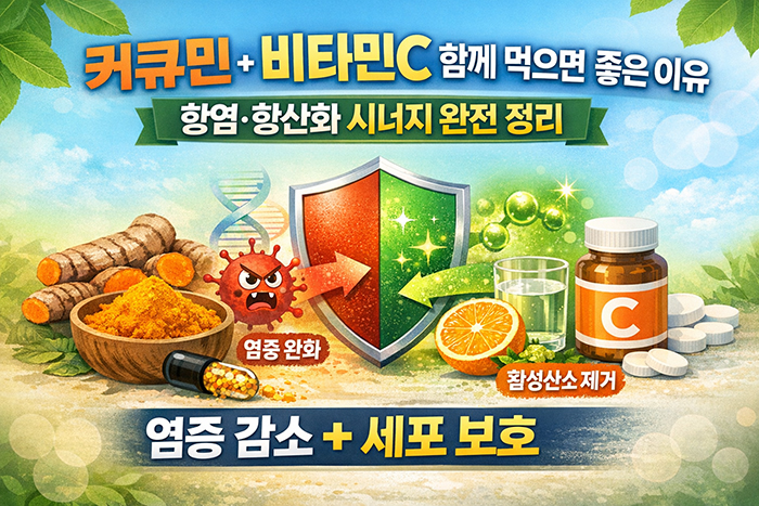 커큐민은 염증 반응 자체를 조절하는 데 강점이 있고, 비타민C는 염증 과정에서 생길 수 있는 활성산소를 줄이는 데 도움을 줍니다.