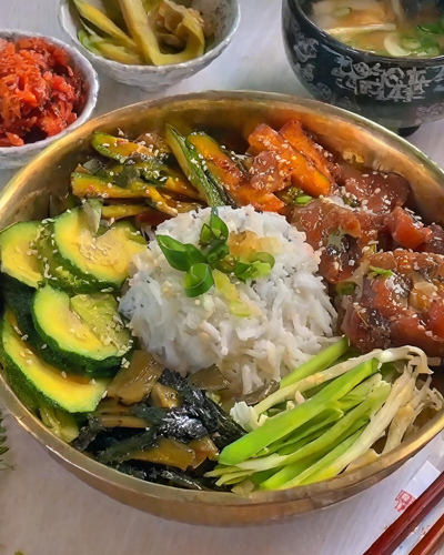 지속 가능한 에너지를 위한 균형 조정법: 구운 닭고기나 두부 같은 지방이 적은 단백질 공급원을 첨가한 콩나물 비빔밥은 균형 잡힌 식사를 보장합니다. 단백질은 근육 회복, 면역 기능 및 전반적인 포만감을 유지하는 데 중요하므로 이 요리는 맛있는 식사를 즐기면서 근육을 유지하거나 키우려는 사람들에게 탁월한 선택입니다.