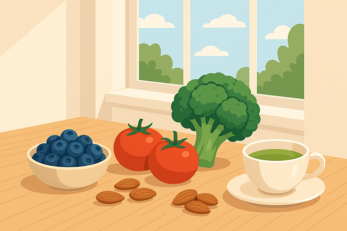 - 추천 식품 : 블루베리·체리·토마토·브로콜리·시금치·아몬드·녹차·카카오
