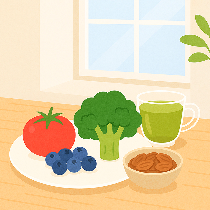- 추천 식품 : 블루베리·체리·토마토·브로콜리·시금치·아몬드·녹차·카카오