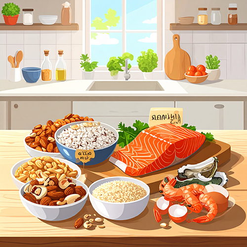 • 해산물: 새우, 굴, 정어리, 연어, 참치