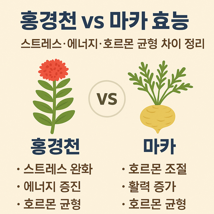 정신적 에너지와 집중력이 필요하다면 → 홍경천, 체력 회복과 호르몬 균형이 중요하다면 → 마카를 선택하는 것이 좋습니다.