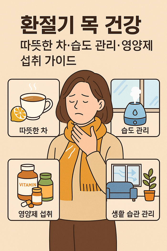 요약: 환절기에는 일교차와 건조한 공기가 겹치며 목 점막의 방어력이 떨어지기 쉽습니다. 본 가이드는 따뜻한 차, 실내 습도, 영양제, 생활 습관까지 실천 가능한 방법을 한 번에 정리했습니다.