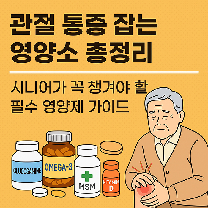 핵심 요약: 나이가 들수록 연골 마모와 윤활액 감소로 무릎·어깨·손목 등 관절 통증이 잦아집니다. 글루코사민·콘드로이틴·MSM·칼슘·비타민 D3·콜라겐 펩타이드 등 영양소를 꾸준히 보충하면 통증 완화와 관절 기능 유지에 도움이 됩니다. 아래 가이드는 시니어가 실전에서 바로 적용할 수 있도록 복용량·주의사항·생활 습관·Q&A까지 정리했습니다.
