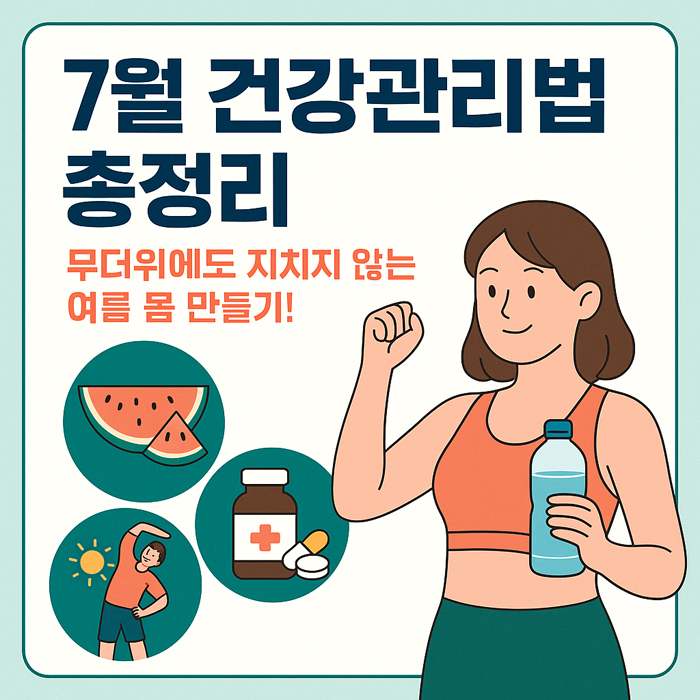 7월 건강은 체온 조절, 수분 보충, 면역력 유지가 핵심입니다. 식단, 수면, 운동, 영양제까지 균형 있게 챙기면 무더위에도 지치지 않는 여름 몸 만들기가 가능합니다.