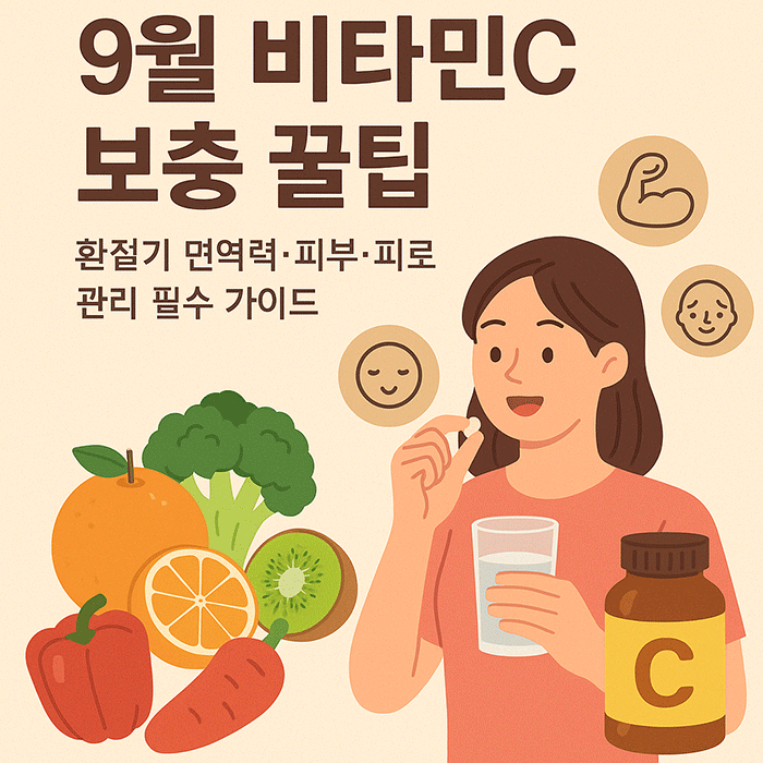 환절기 컨디션이 흔들리는 9월, 비타민C의 꾸준한 분할 섭취는 면역·피부·피로 관리를 한 번에 잡는 실속 전략입니다. 제철 식품으로 기본을 채우고, 상황에 맞는 보충제를 더해 500~1000mg/일을 안정적으로 이어가세요. 작은 습관이 가을 내내 컨디션을 지켜줍니다.